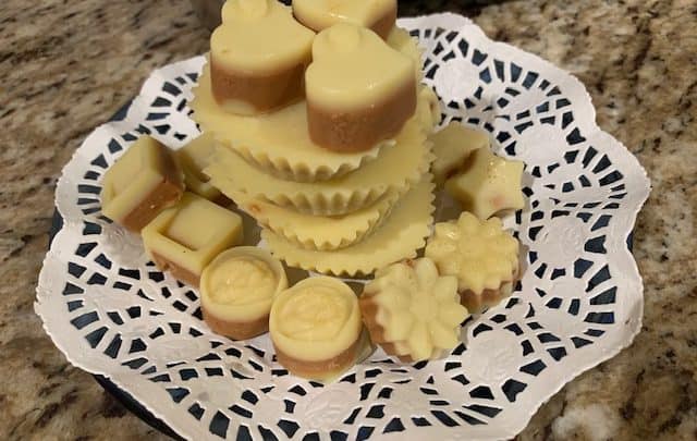 4. Add about a half teaspoon of peanut butter to each mold and top with remaining white chocolate mixture. Freeze for another 15 minutes or until set